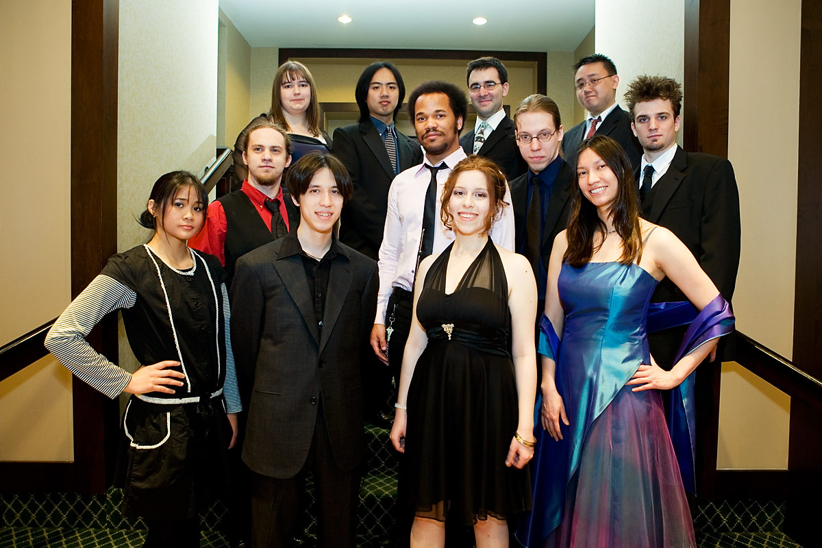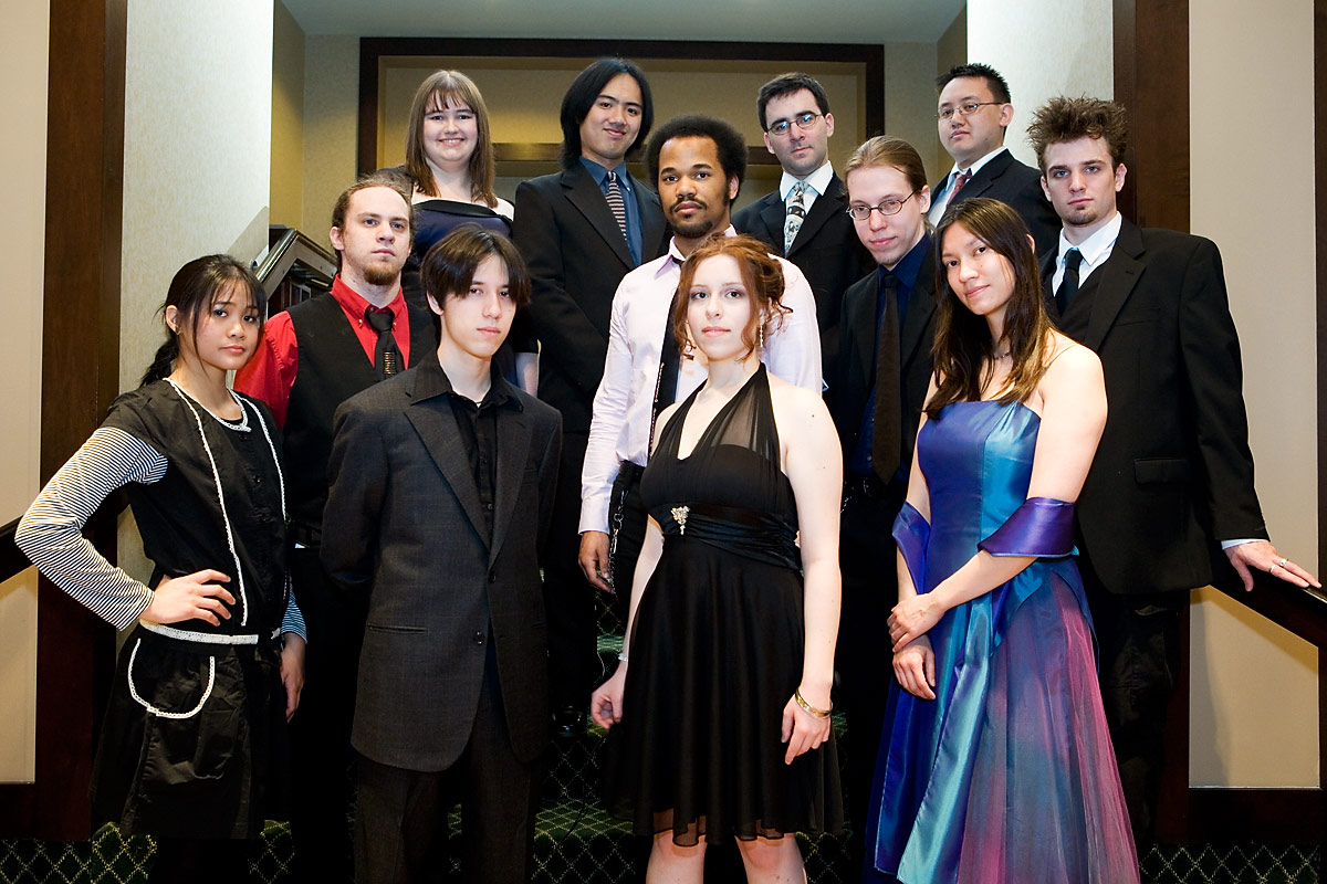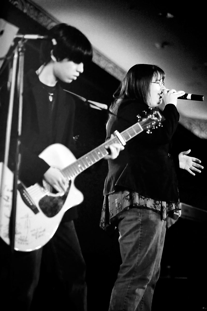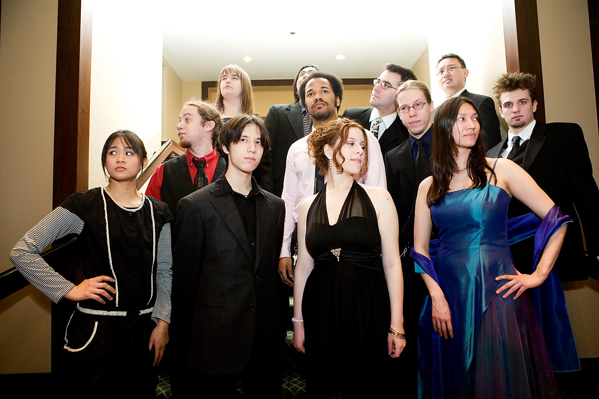 Anime Central photoshootThe Spoony Bards, together......and in concertBack to Gallery Index | Back to EventsA mea culpa on this one - we were short on time and it had gotten dark so we kept the big group shot really short, having about 10 minutes or so. Stealing a stairwell, it's more of a class photo than a band photo, but it's something, and I'll corner them for another shoot when next we meet. As for the concert photos, well, I was silly and figured I'd be unobtrusive and not use flash - the problem was the stage lights were all pretty much red and purple, meaning most things got a pretty strong cast to it, hence why I went for black and white or things look really colourful. Some I kinda went for the posterized look, since it seemed to work well with the single color light. Thanks everyone, we'll have better photo time as a group when next we meet, and enjoy the pics. |