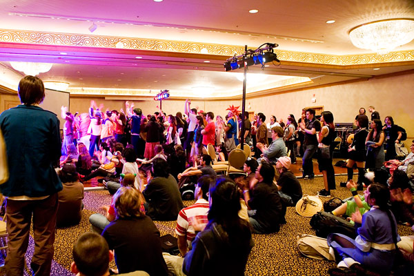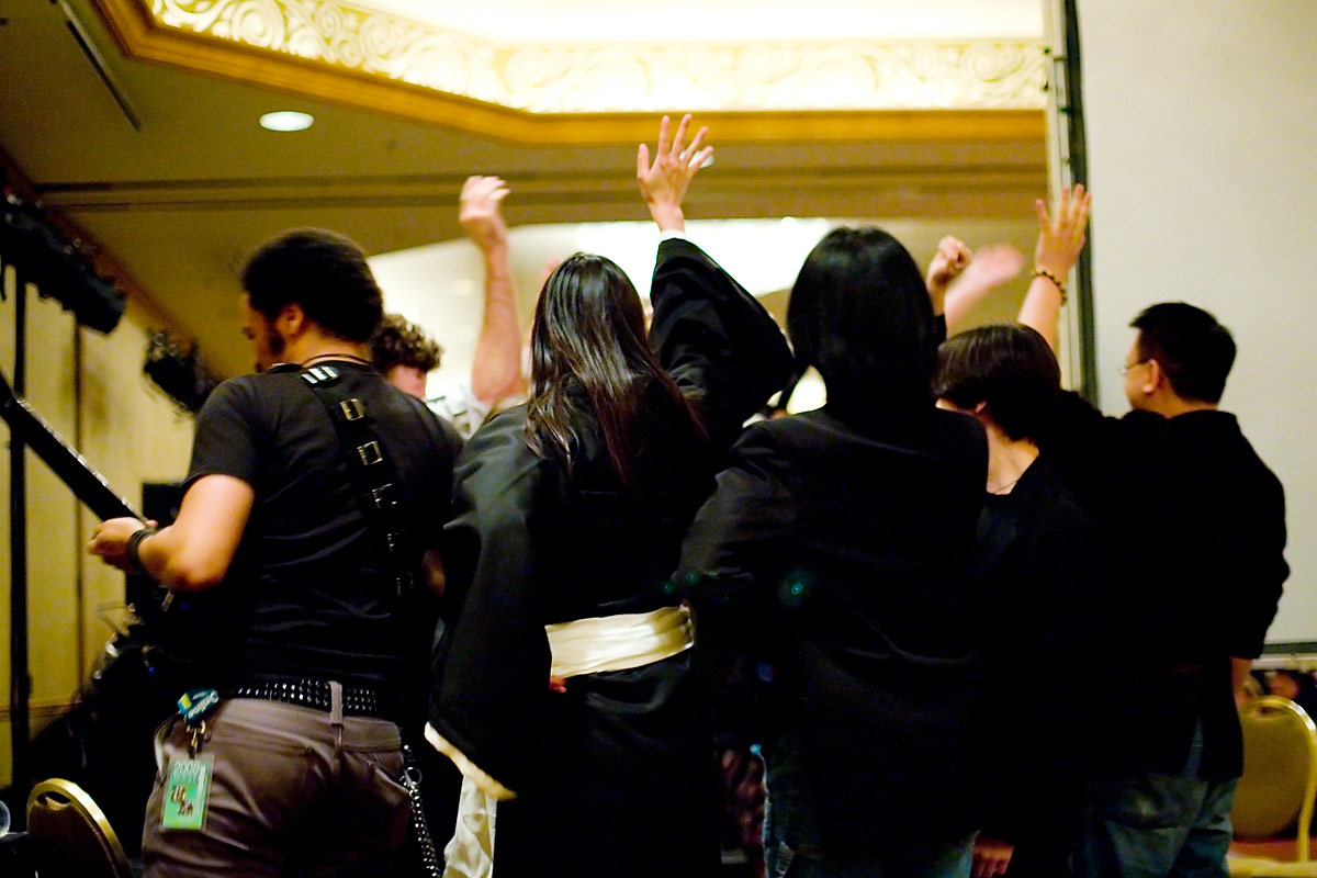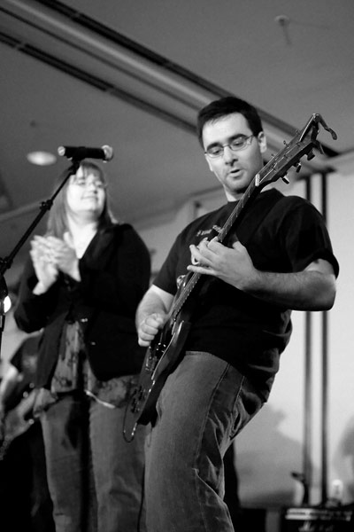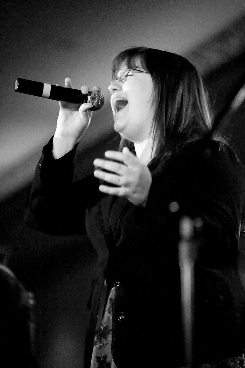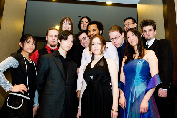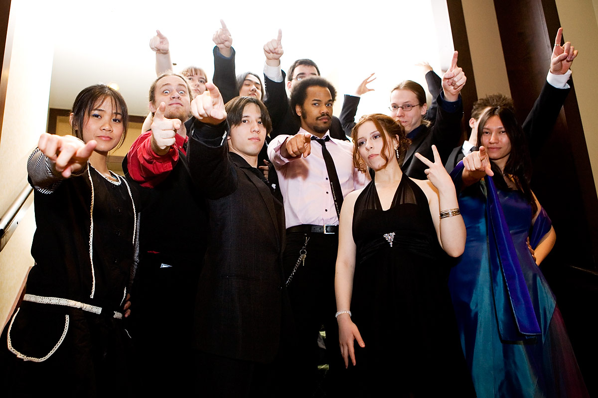 Anime Central photoshootThe Spoony Bards, together......and in concertBack to Gallery Index | Back to EventsA mea culpa on this one - we were short on time and it had gotten dark so we kept the big group shot really short, having about 10 minutes or so. Stealing a stairwell, it's more of a class photo than a band photo, but it's something, and I'll corner them for another shoot when next we meet. As for the concert photos, well, I was silly and figured I'd be unobtrusive and not use flash - the problem was the stage lights were all pretty much red and purple, meaning most things got a pretty strong cast to it, hence why I went for black and white or things look really colourful. Some I kinda went for the posterized look, since it seemed to work well with the single color light. Thanks everyone, we'll have better photo time as a group when next we meet, and enjoy the pics. |