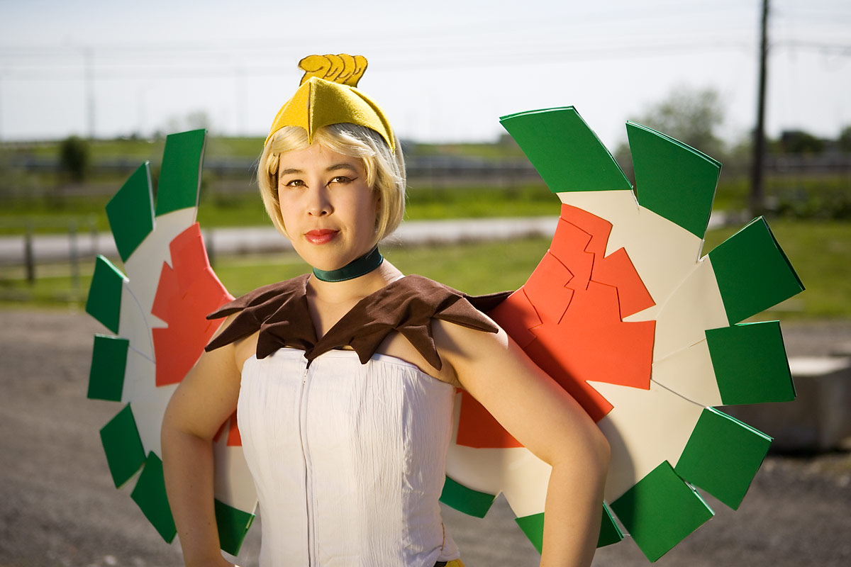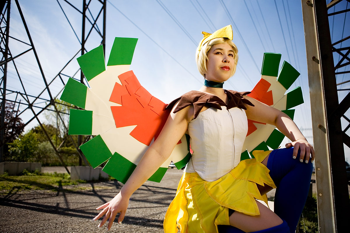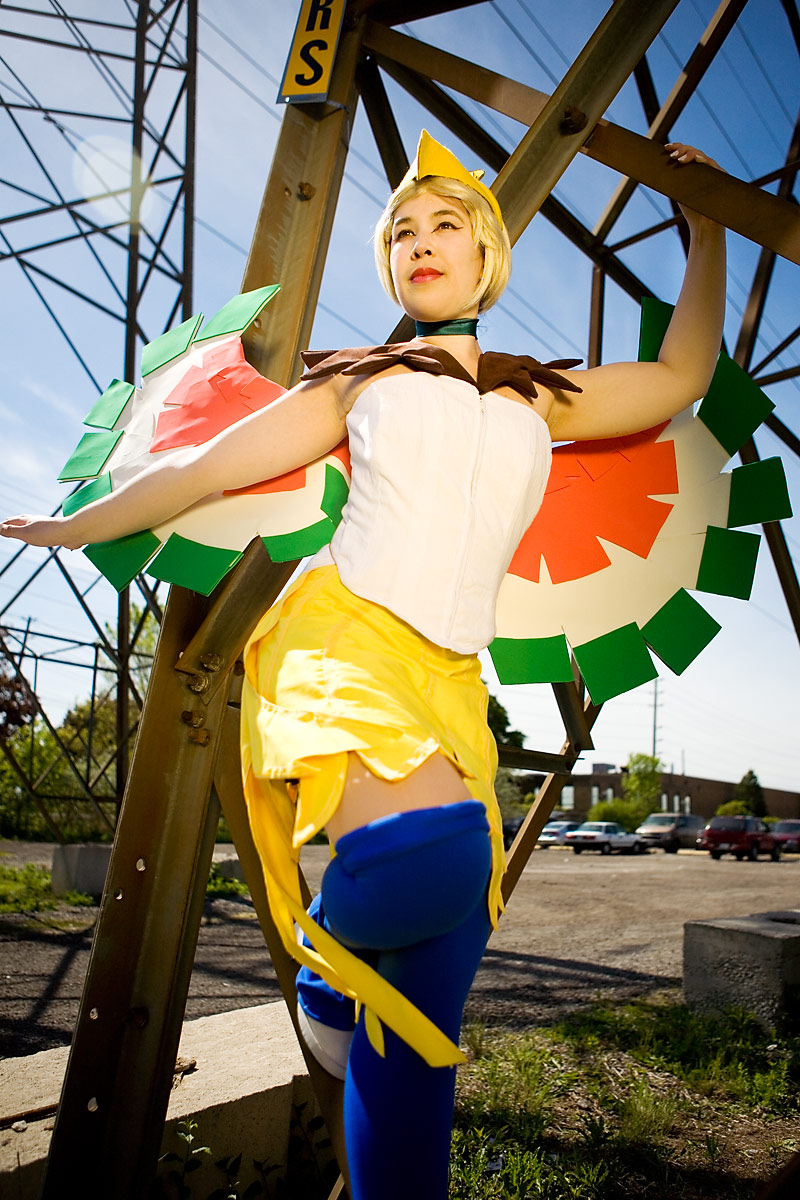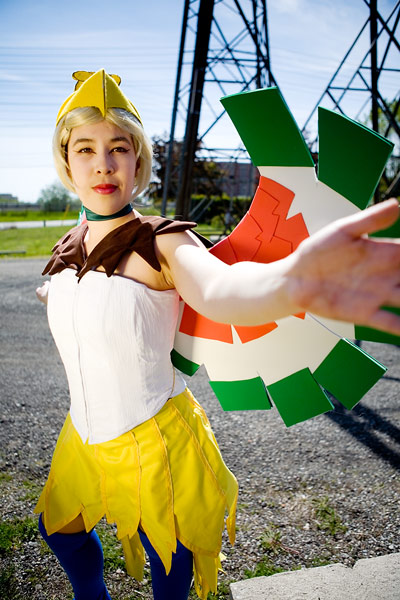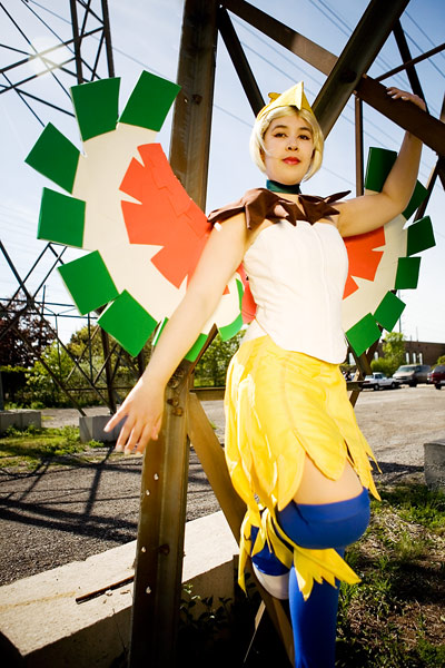 Anime North 2008 cosplay photoshootMageAs Ho-oh (Gijinka)Source: PokemonBack to Gallery Index | Back to EventsShe had wings on, but for the record, they didn't let her fly, leaving her to scale the cinderblocks and power towers for these shots. Add in the wind on the wings and the reflector sizzling her retinas, and she's pretty much a champ for taking that abuse. And, I think the photos we got made it worth it - lots of nice colour in these shots and it really suits the costume to have her up there. Thanks to Mage for not blindly plunging to her doom, and enjoy the pics. |