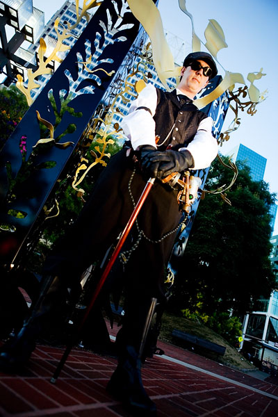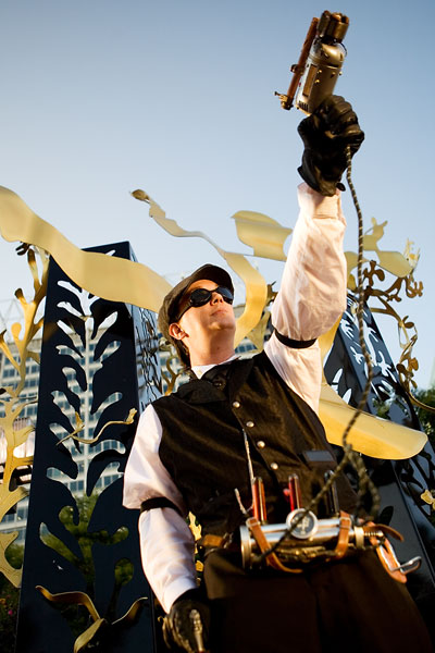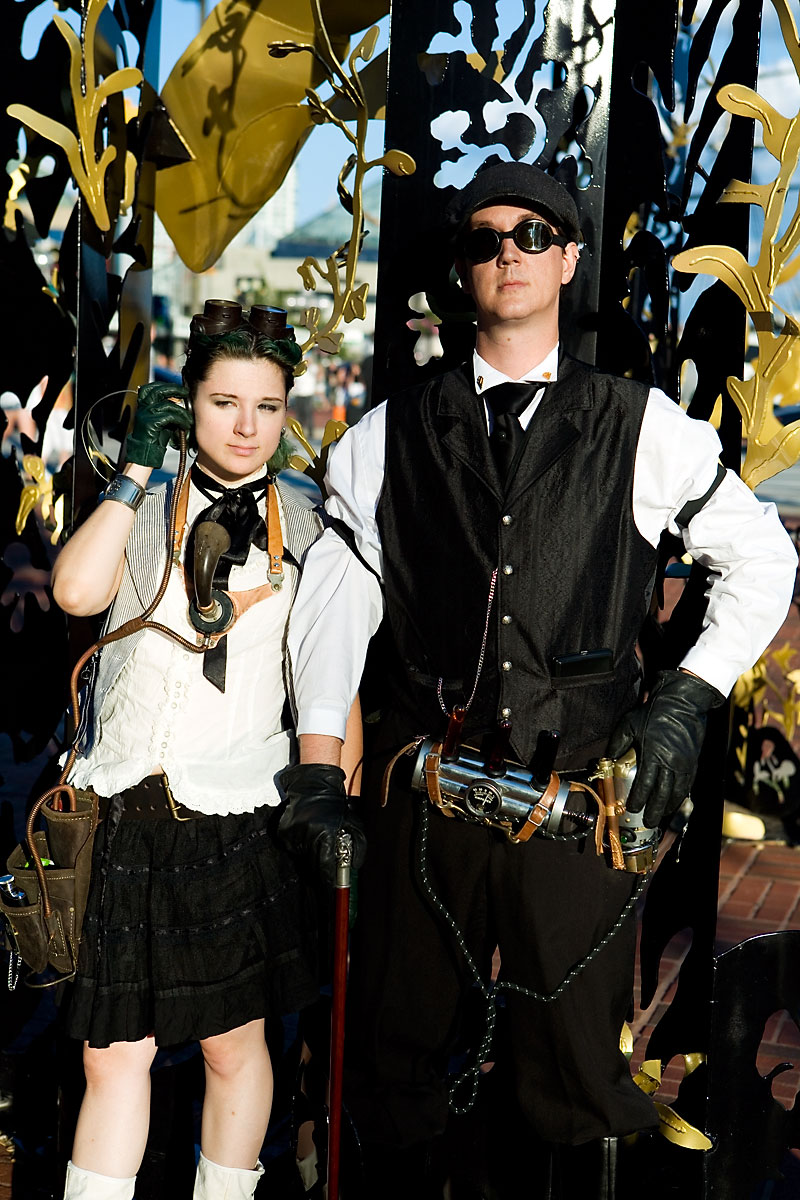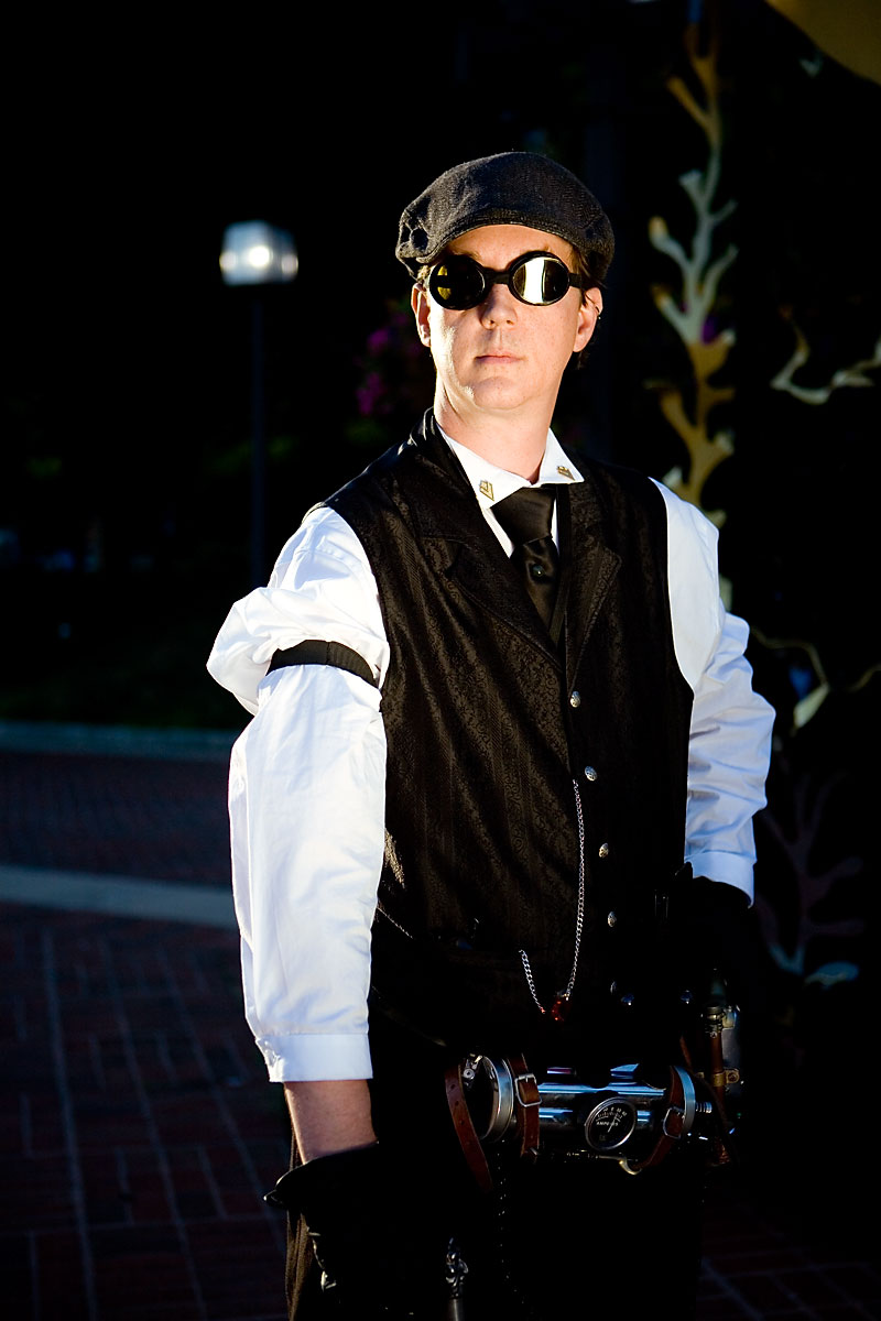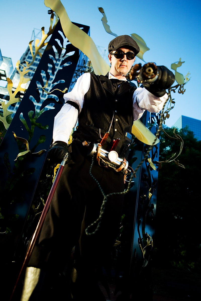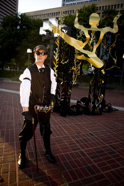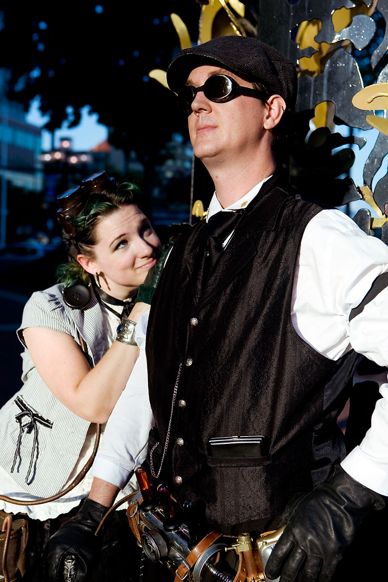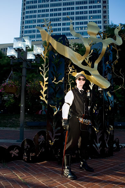 Along with Bunny, Chad had assembled his death ray and other steampunk ephemera for a sweet costume. Actually, to tell the truth, he kinda has this stuff on him most of the time anyway, but that's another matter altogether. Along with Bunny, these two intrepid adventurers quested forth to discover... er, some bronze statues and other scenery around the fountains for photos. Thanks to Chad for kicking it *truly* old school, not to mention putting up with my getting them to wander long distances for photos, and enjoy the photos. |