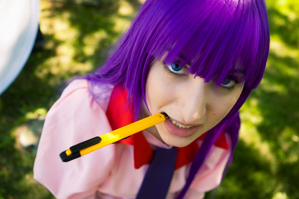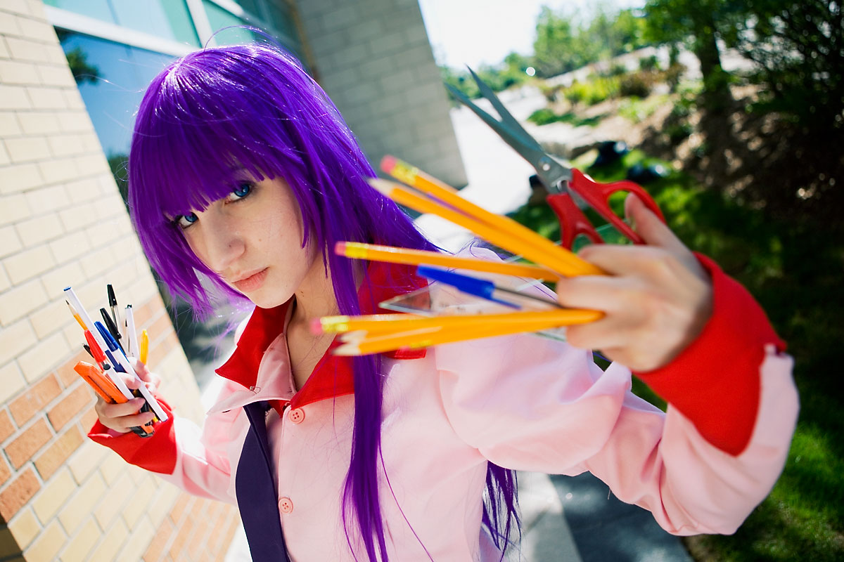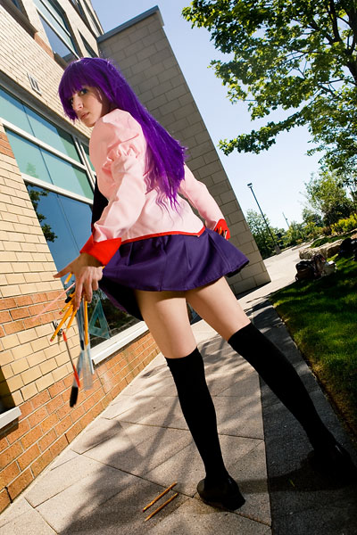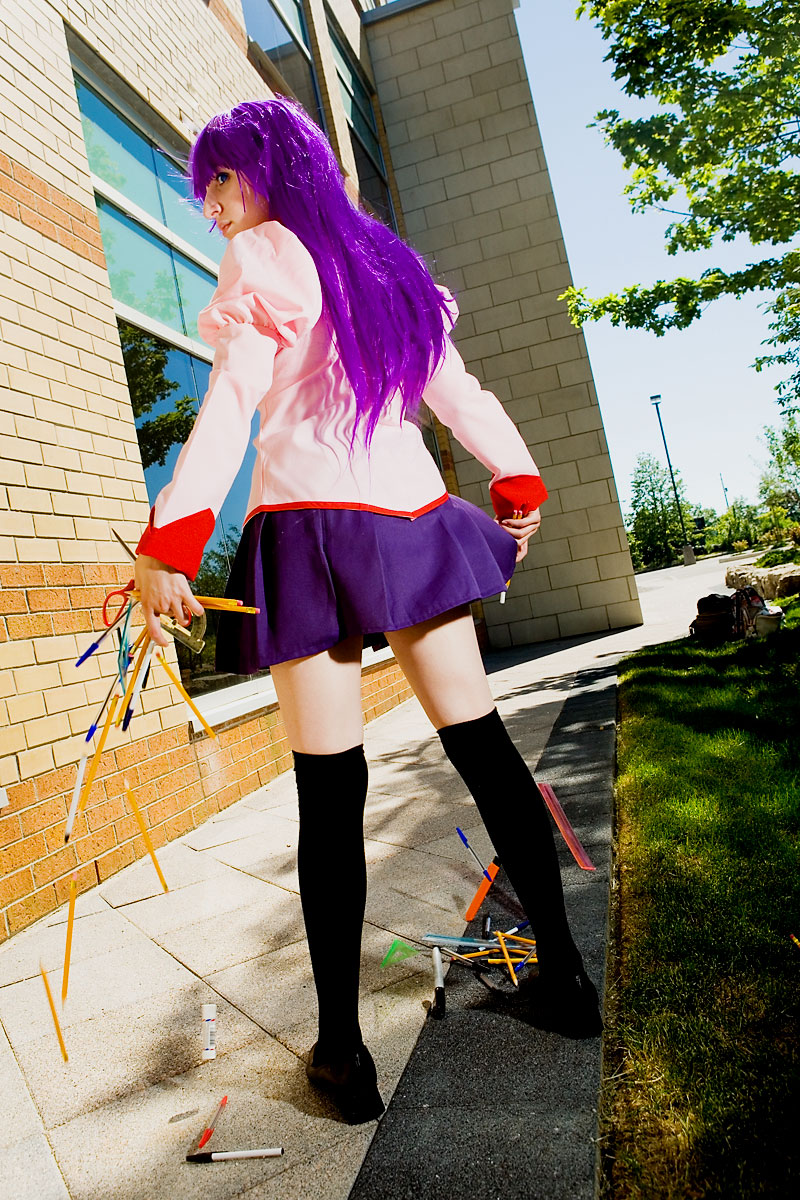Now, one of the key parts to this shoot was the action shot - the skirt dumping out reams of pens and other implements of death in action. Thankfully, Ika is a major trooper when it comes to things like that - setting up, dumping pens, gathering the bits and doing it over and over again are what you need for a shot like this, and she was game for it. Anyway, I think it paid off, and we had a nice shoot. Thanks to Ika for being such a trooper for so many photos, and enjoy the set. |