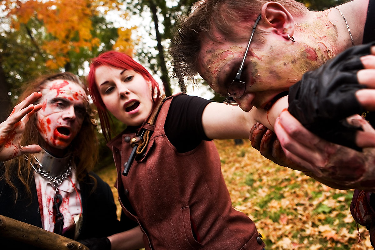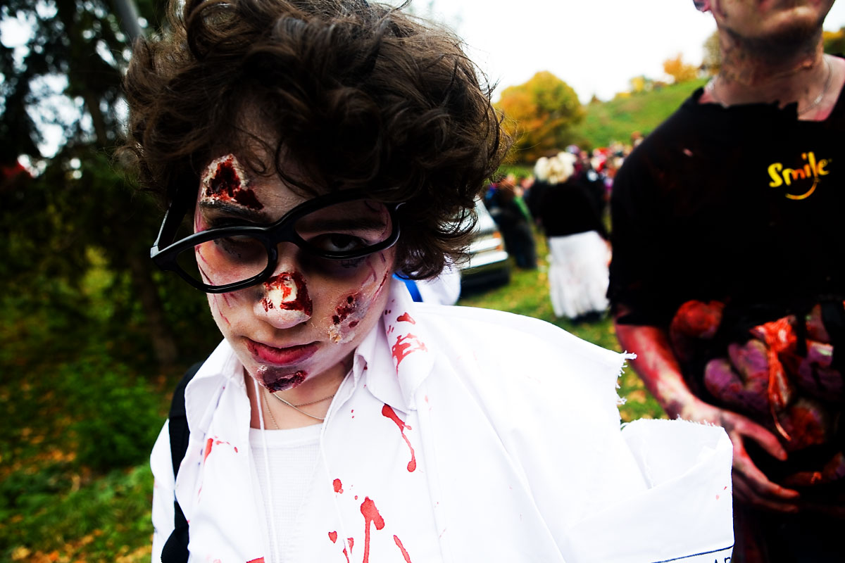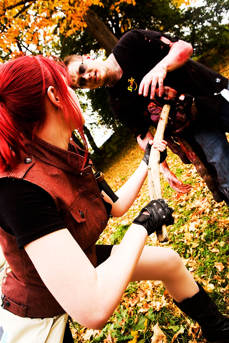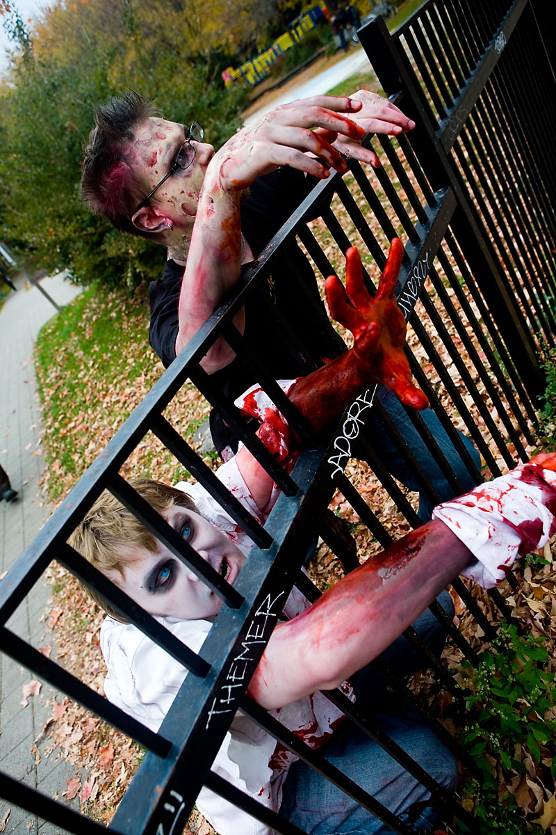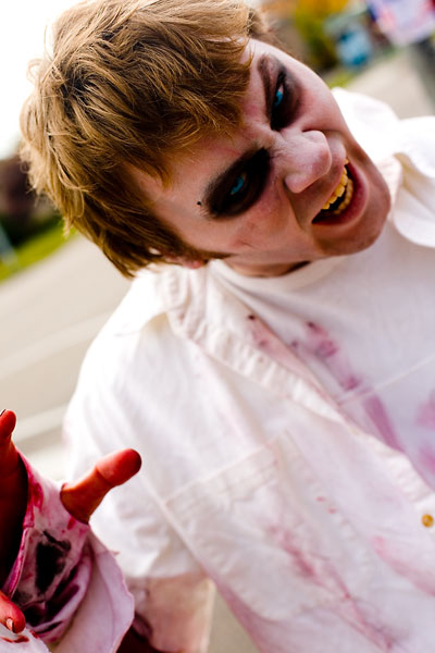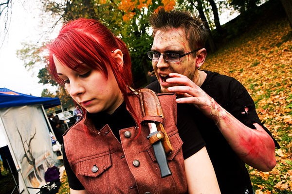 Once the zombies (or zombies to be) arrived at the park they had a nice large area for them to mill around in, complete with brain concession stands, photo pits, sponsor areas, makeup places etc. Anyway, we figured it'd be a good time to get some shots in. Now, the only hitch was weapons were out, so our heroes battled hand-to-hand against zombies for this part. Sadly they succumbed to the virus, but hey, it meant they got to join in on the fun and merriment of a parade of decaying corpses, so I see it as a win-win situation... |