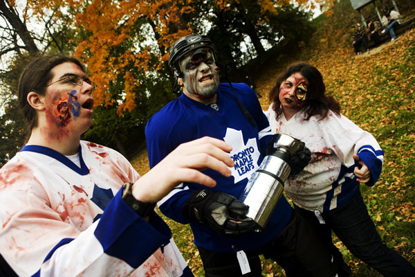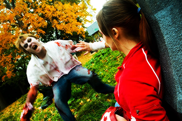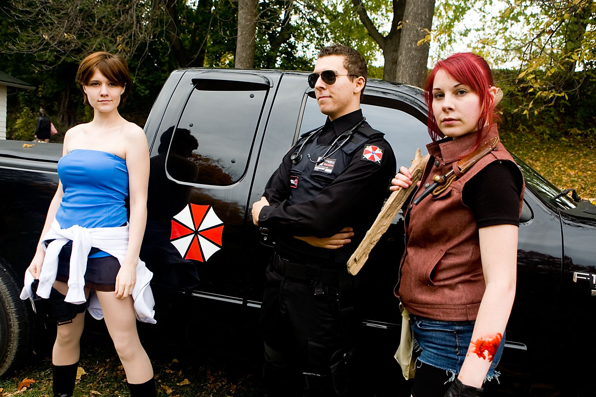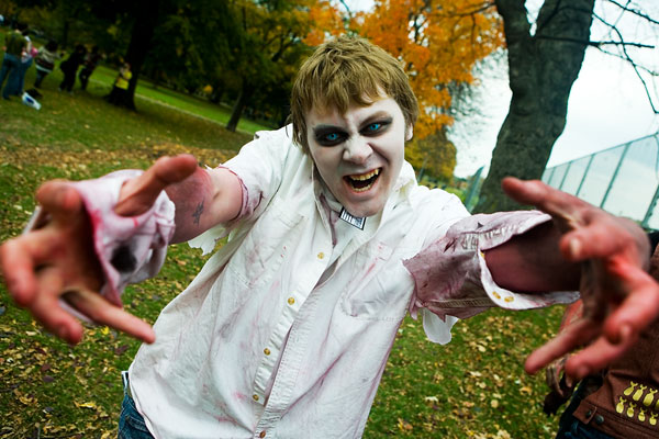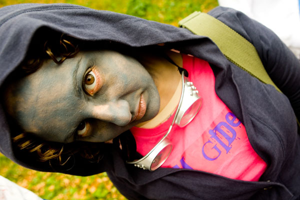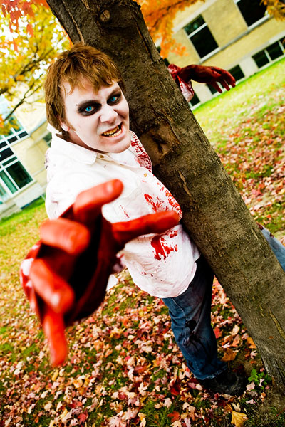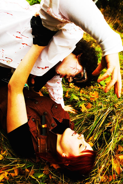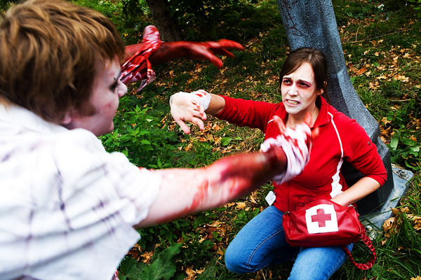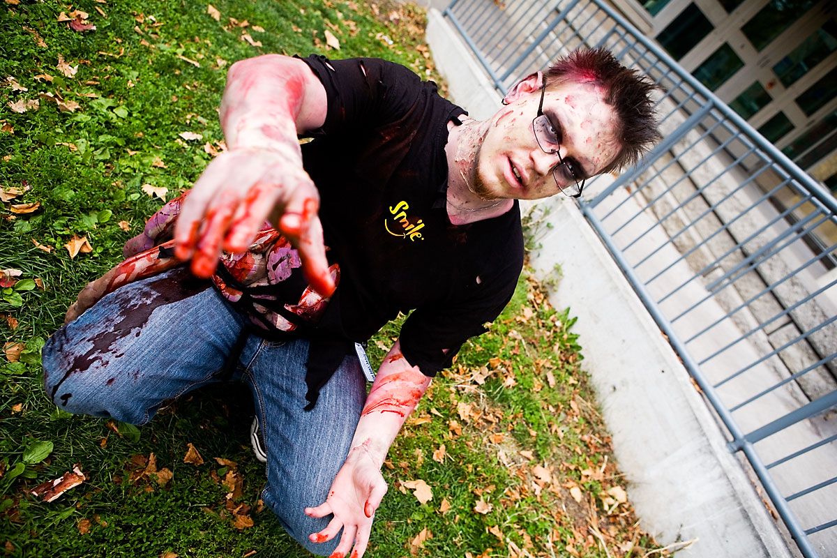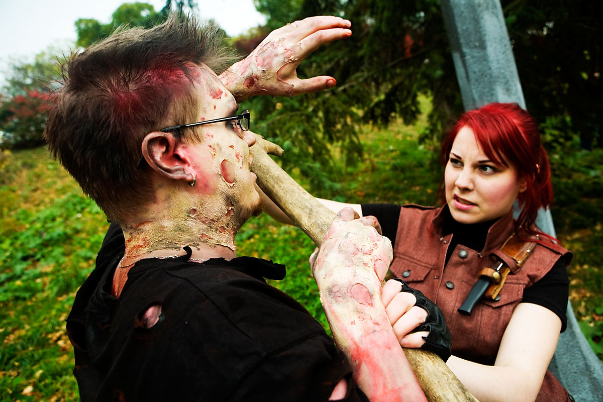 Once the zombies (or zombies to be) arrived at the park they had a nice large area for them to mill around in, complete with brain concession stands, photo pits, sponsor areas, makeup places etc. Anyway, we figured it'd be a good time to get some shots in. Now, the only hitch was weapons were out, so our heroes battled hand-to-hand against zombies for this part. Sadly they succumbed to the virus, but hey, it meant they got to join in on the fun and merriment of a parade of decaying corpses, so I see it as a win-win situation... |