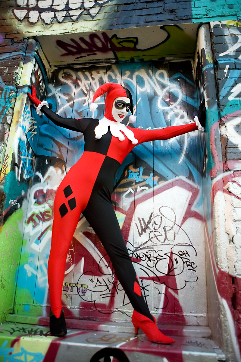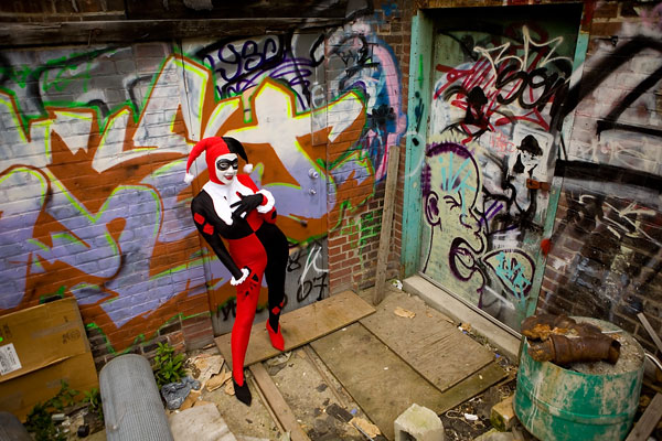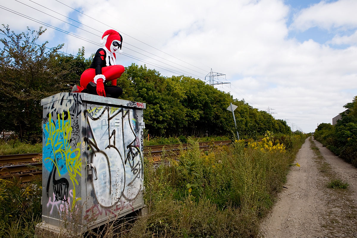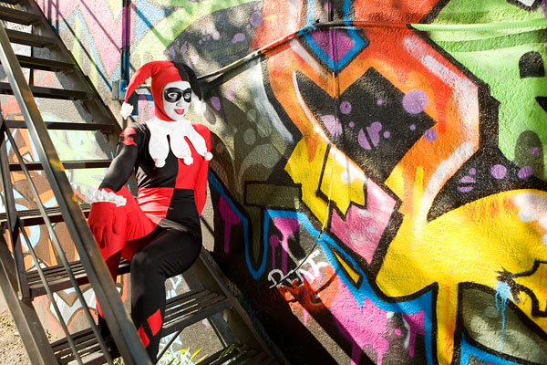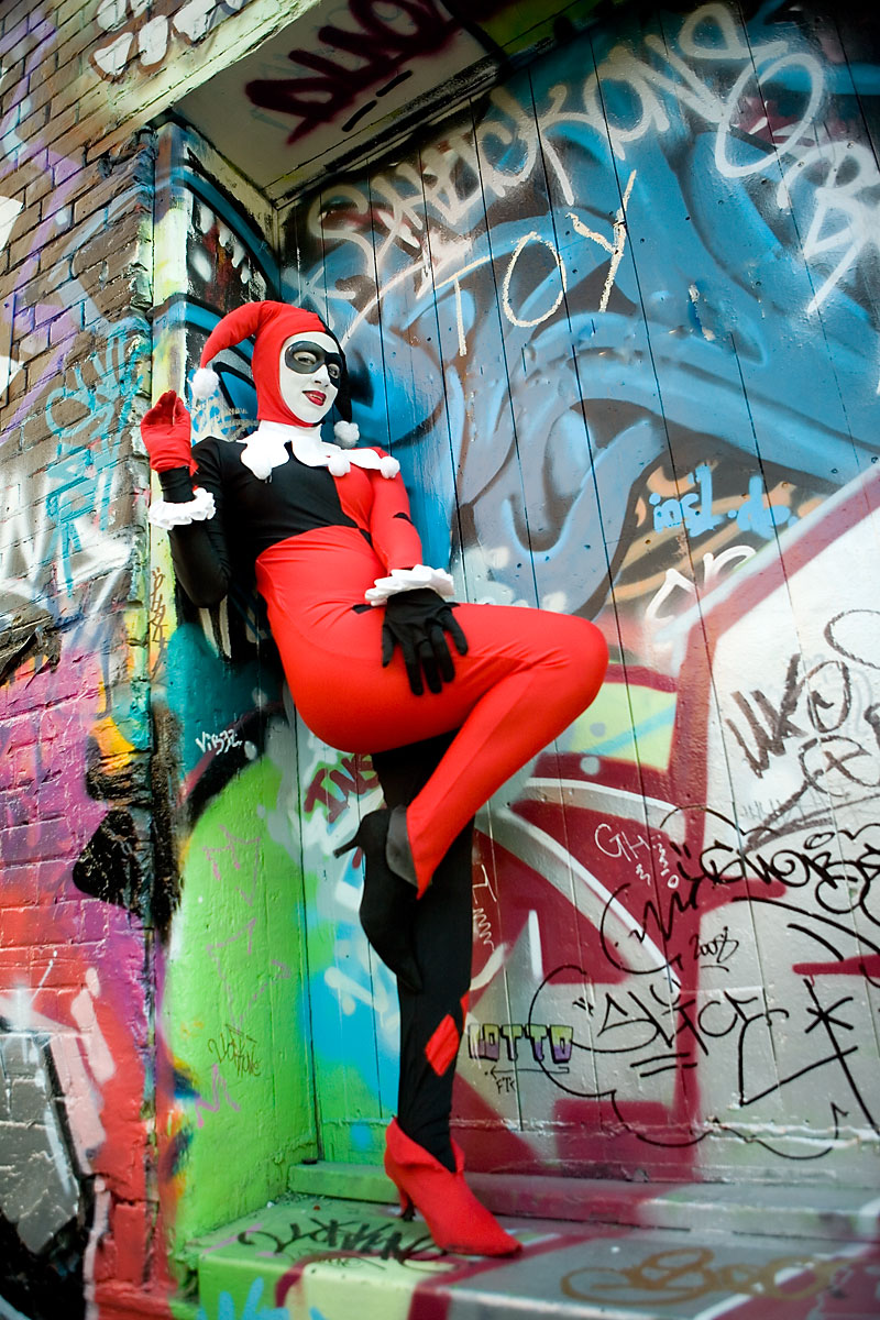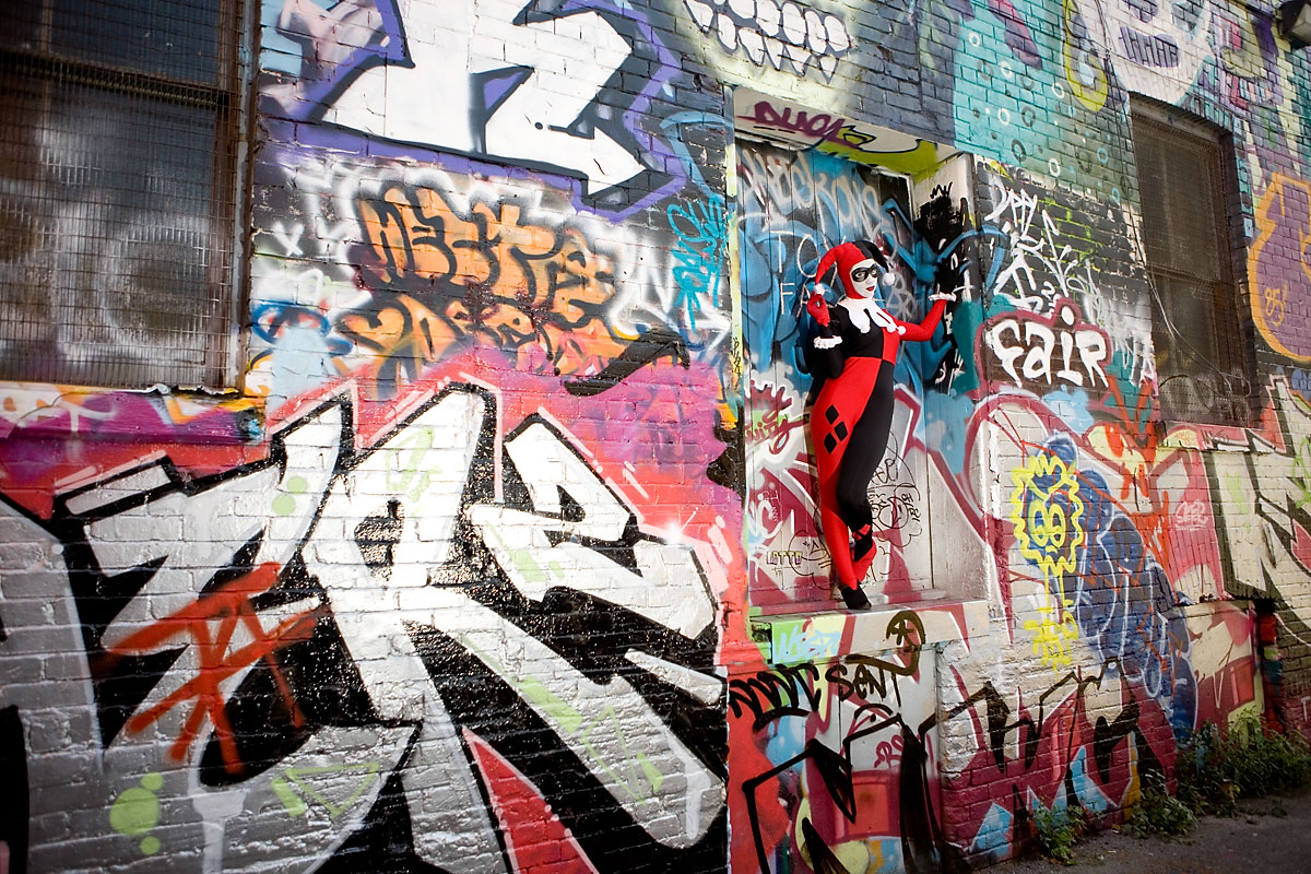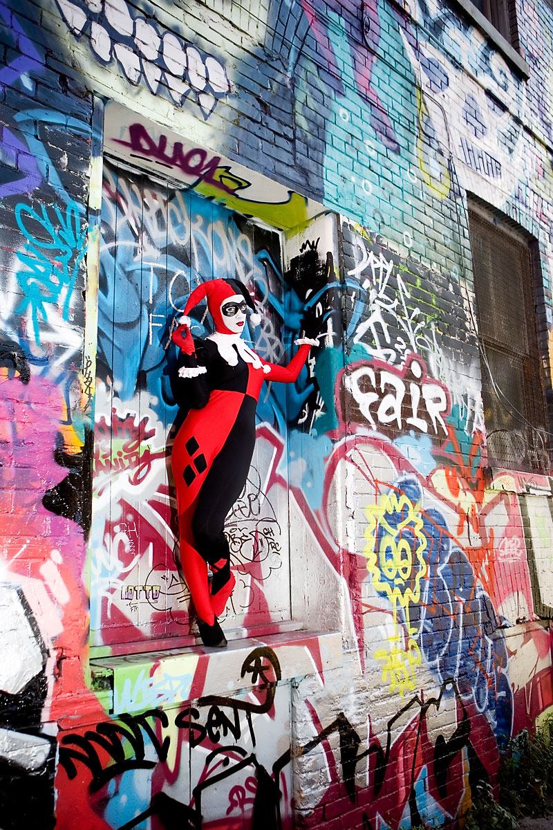 Later, we moved over to an area downtown open to graffiti, open for contests and just general use, and it gave lots of nice colour to a dark alley. Megpie was awesome, happy to climb rail switches, trash heaps and window ledges and show her sexy-but-psycho Harley Quinn look. Thanks to Megpie for running around a major city in spandex, and enjoy the photos. |