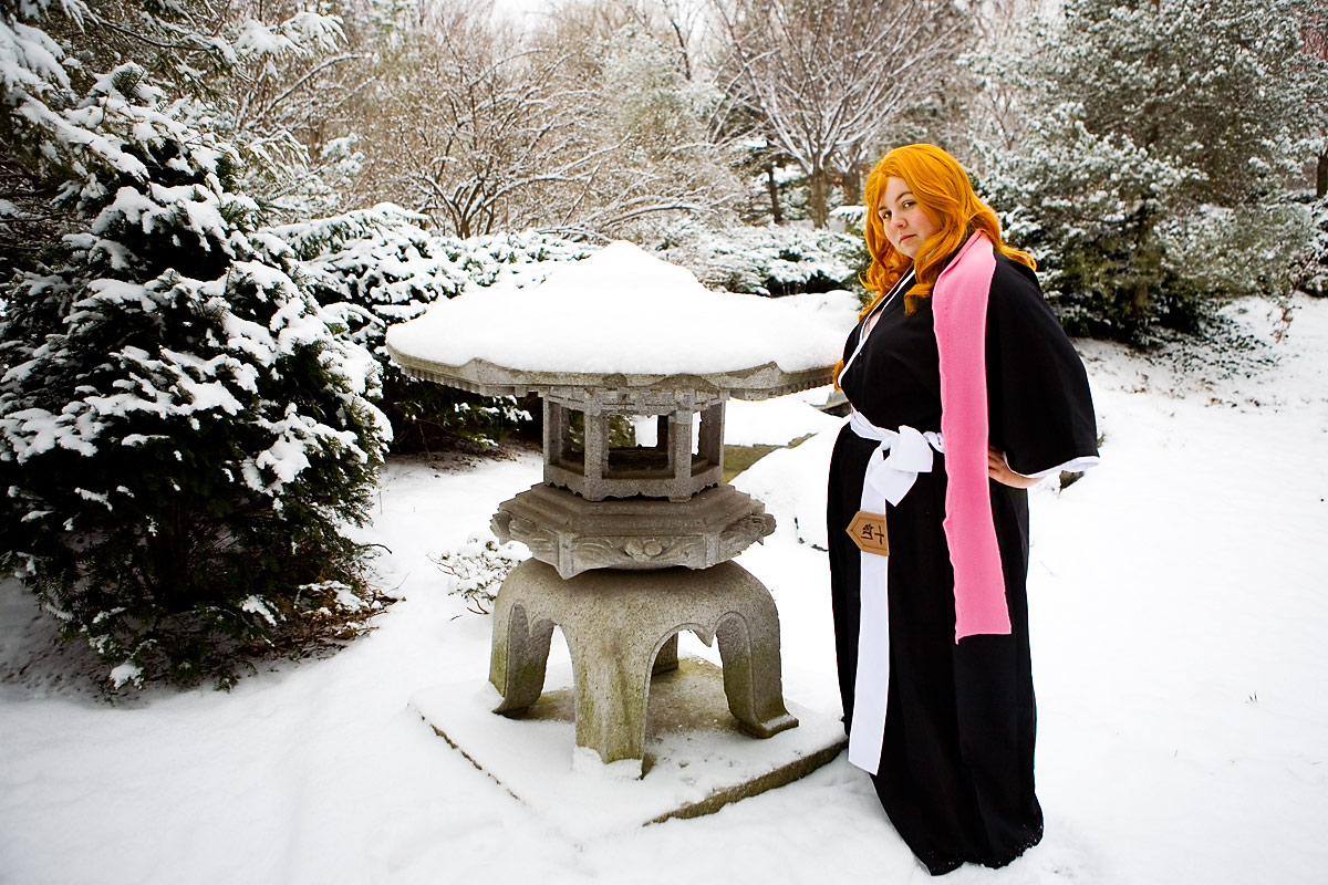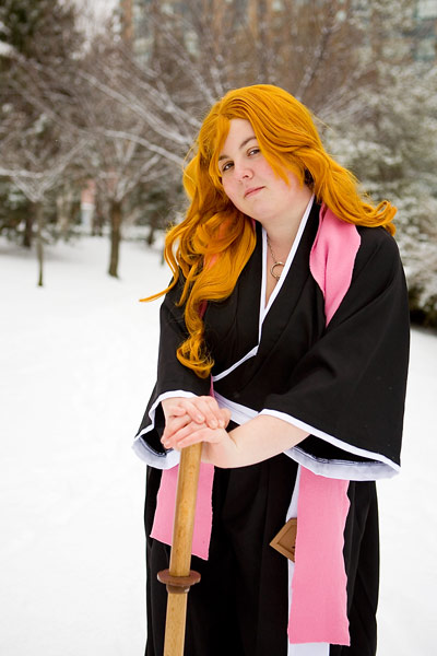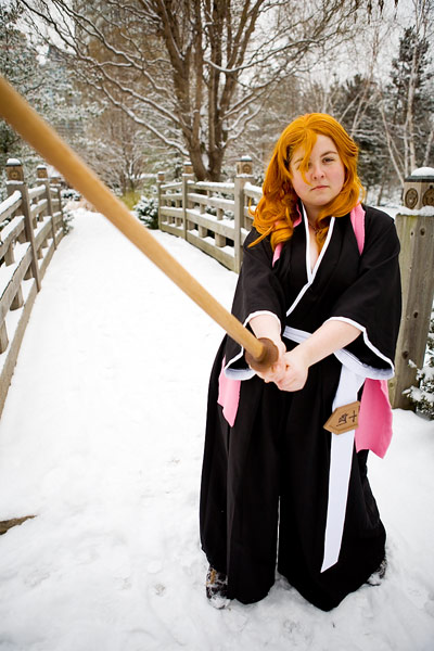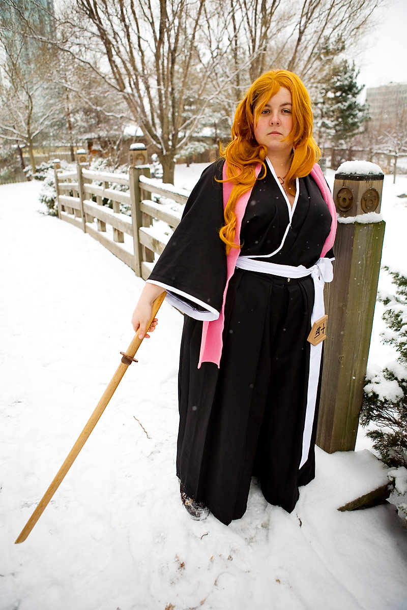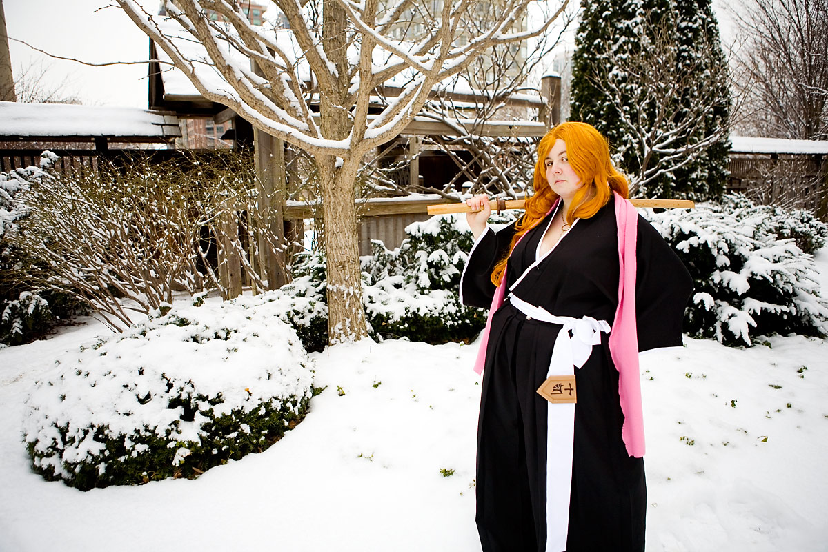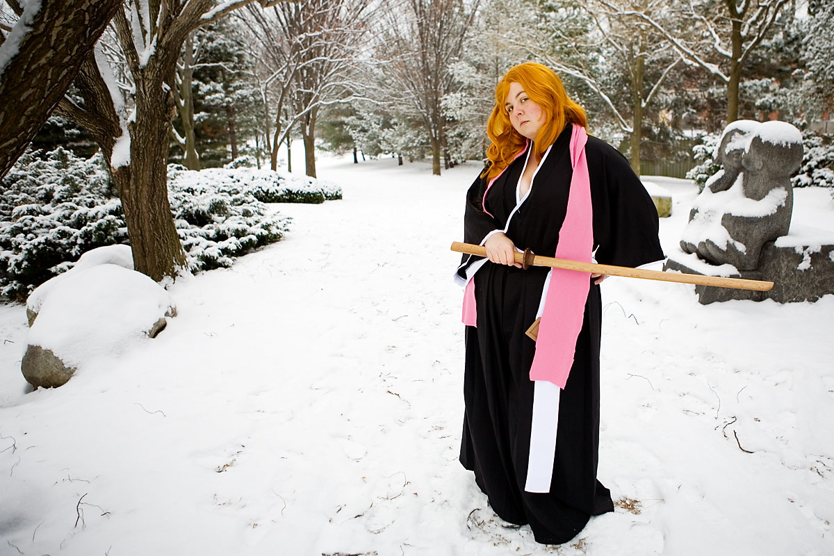 Swords, snow, setting and a photoshoot - works for me. Bleach outfits are kinda interesting for this setting, since they're black and white, leaving pretty much the only colours being the flesh/hair tones and accent colour they have, in this case a pink scarf. So it's kinda stark, but it's a neat look.