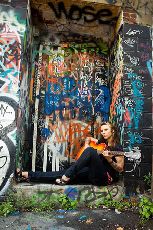 There comes a point in every photographer's life where they must photograph a band, and with that choice comes the inevitable decision to use a brick-wall-and-alleyway setting for the photos. Okay, so it's not the most revolutionary concept in band portraiture, but we had a short window to get the shots, so Queen street graffiti alley it was. The band name is 21 and Rockabilly is the game, with Alex (Ace) on vocals, Marisha (Diamond) on guitar, Matt (Jack) on Bass and Steph (Spade) on drums. Long story short, a weekday evening was spent chasing the sun and getting some shots amongst nice scenery for some school publication/project that I'll cite when I get a chance. Anyway, it was a light, fun shoot, and we got some good pics - thanks to them all for putting up with me, especially since they weren't photo regulars but still okay with playing along. Enjoy. Final thoughts: I'm usually worried about shoots with strangers and limited time frames. This, however, worked out pretty well. Maybe they'll remember me when they grace the cover of Rolling Stone or something...[grin]