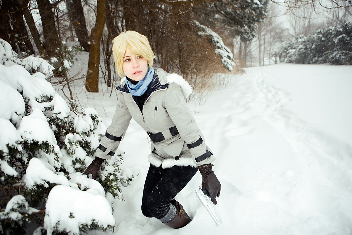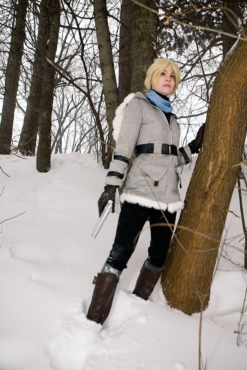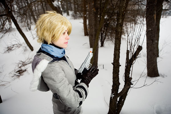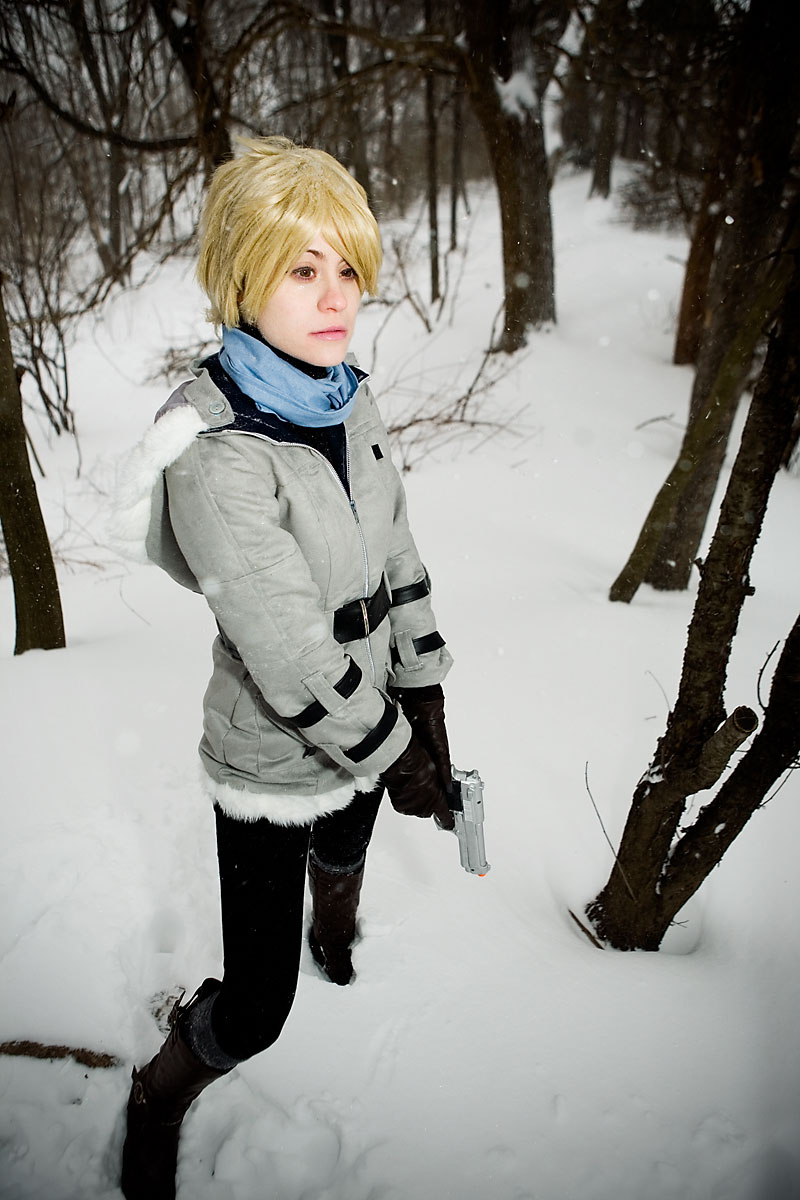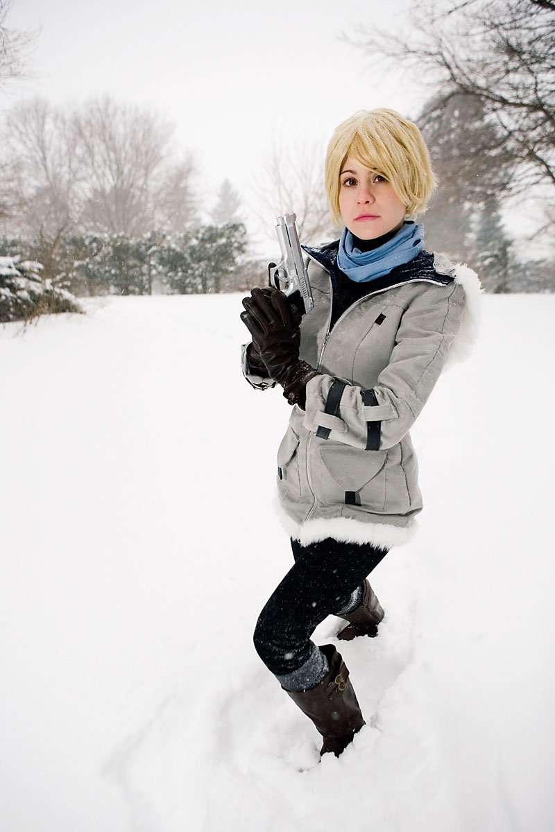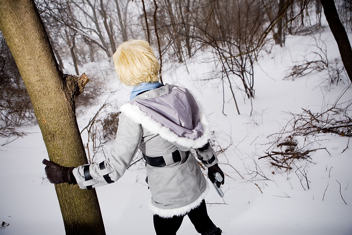 First off, we had Sherry Birkin. This one was tricky for a few reasons, among them the unplowed sidewalks and roads, but also the fact that school just got out and we were doing photos with guns. Right next to a school. So we had to employ a bit of discretion with the gunplay for these shots.